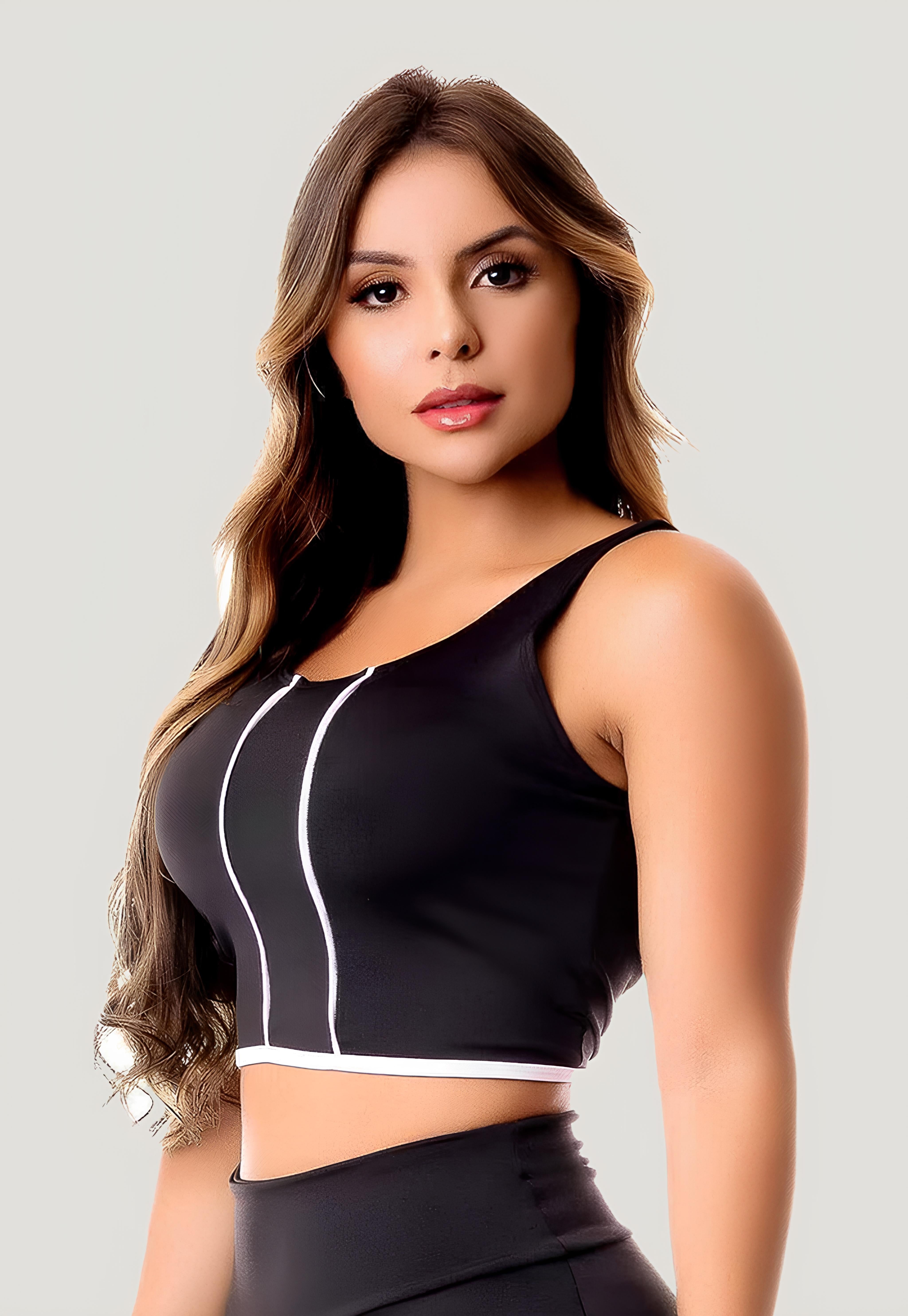 Top Cropped Fitness - Preto com Detalhes em Branco